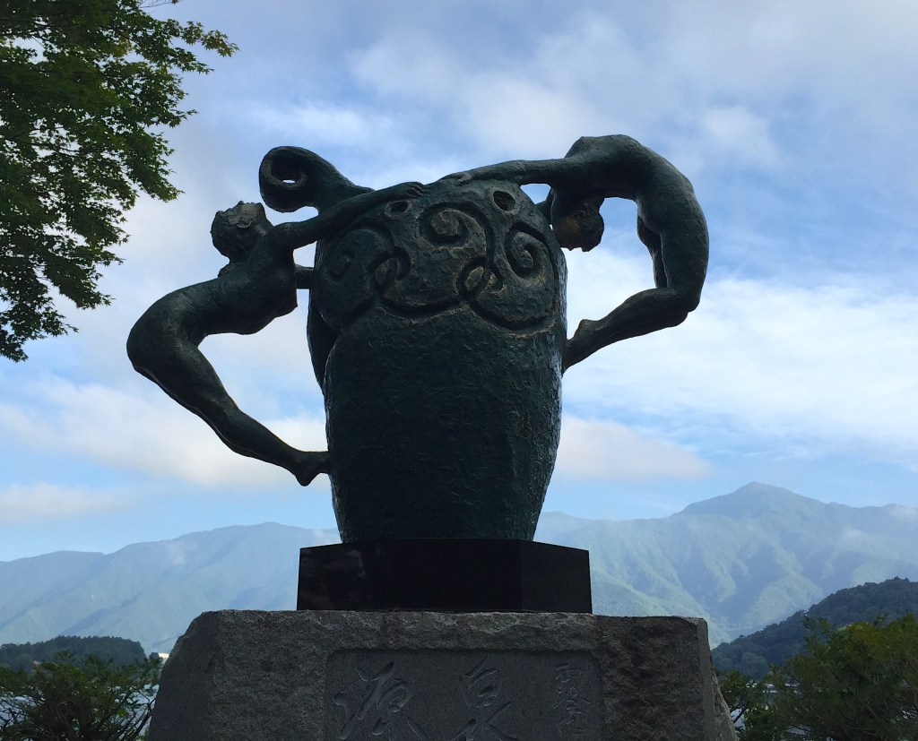 The vase portion of the statue represents Lake Kawaguchiko, source of life in all things.As for two female figures dancing around the vase, woman on left represents “ positive” and woman on right represents “ negative”.the eternally varying drama of these two opposites comes together to become one in “source” flowing to on to symbolise the never ending occurrence and renewal of life.